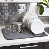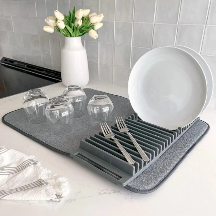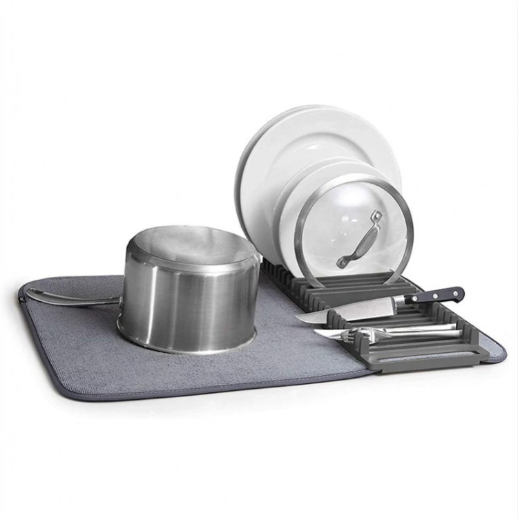 مناسب برای استفاده کنار سینک و کابینت قرارگیری انواع بشقاب، کاسه، لیوان و … ساخته شده از جنس پارچه حوله ای با قابلیت جذب بالا محصولی بسیار با کیفیت ابعاد استند 45×17×2.5 سانتی متری ابعاد حوله نمگیر 61×45.7 سانتی متری دارای 21 محفظه برای قرارگیری ظروف جذب بسیار بالا
